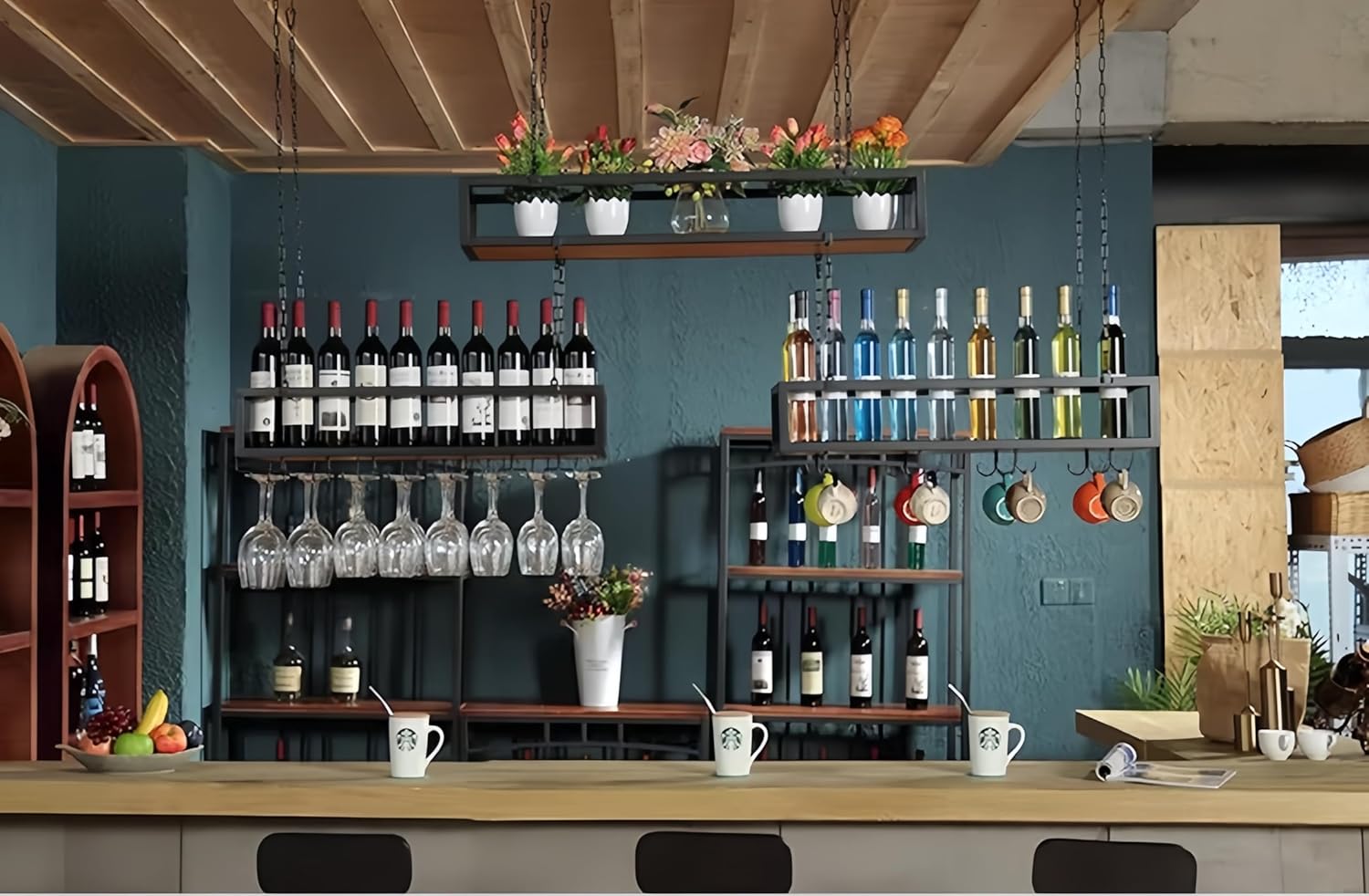 Enhance your home's storage with this hanging wine rack. The upgraded fence safely displays wine tools and decor, preventing falls and ensuring safety.