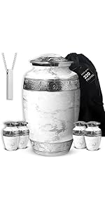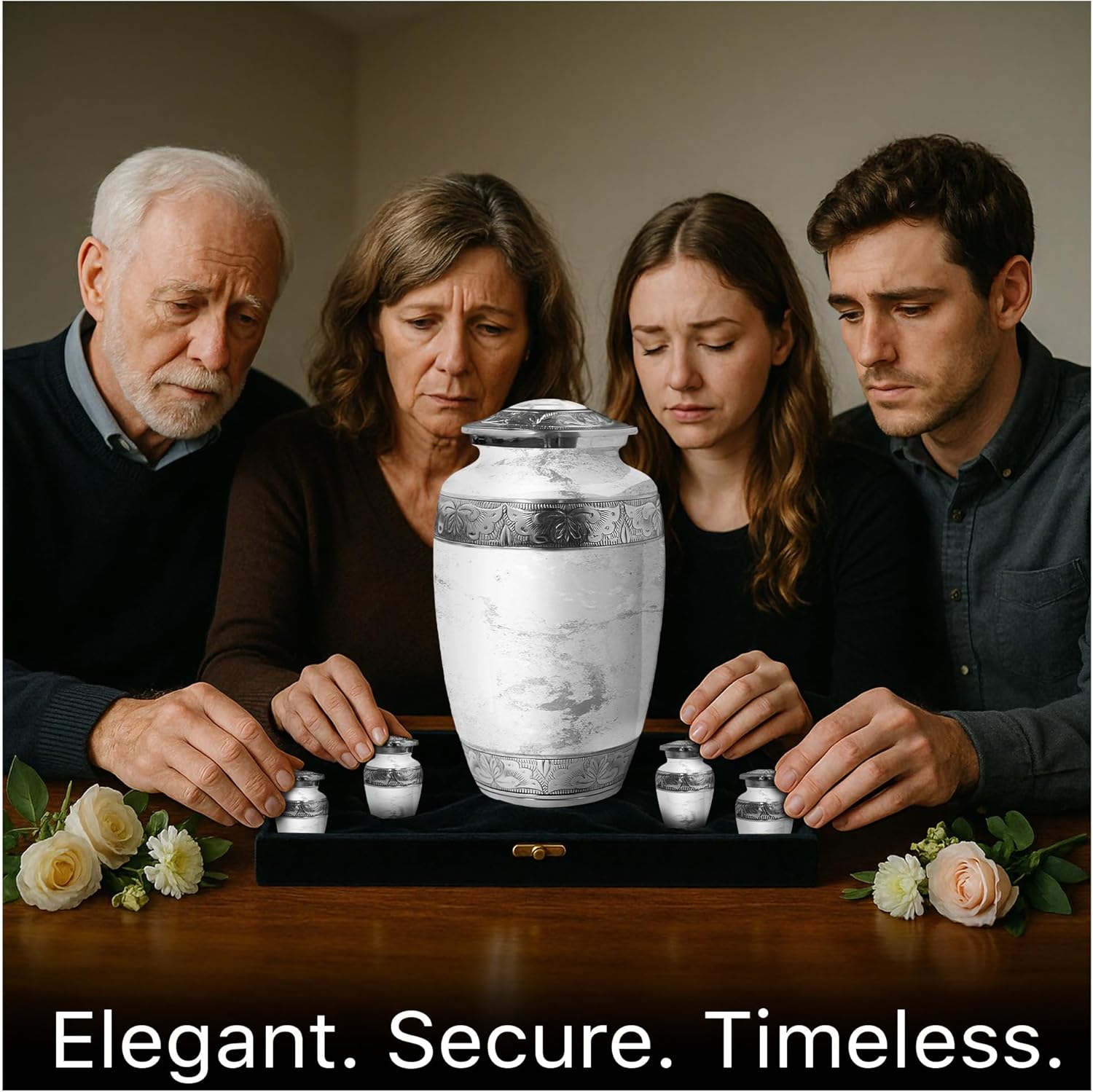Family Tribute White Marble Cremation Urn for Ashes Set – Beautiful Large Funeral Urn for Adult (220lbs) with 4 Small Keepsake Urns & 2 Memorial Ash Necklaces to Honor Your Loved Ones with Elegance